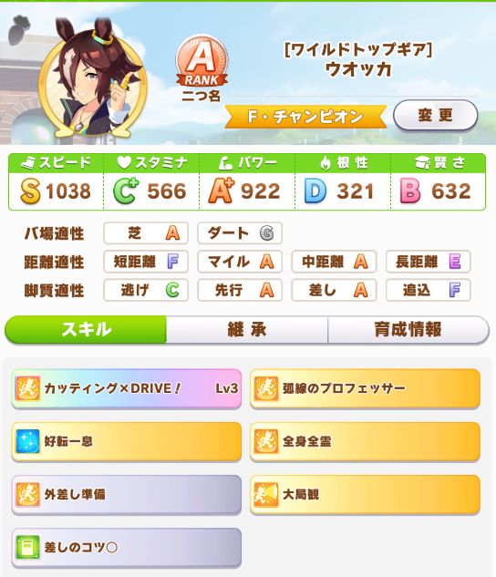 スピードが上振れて、因子もSP5根2URA2地固め2と良い感じで