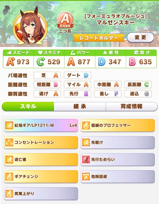 一応ルームマッチでジェミニ杯用に育成してマイルで強いどころと走らせた感じ、道中掛かりやすいわりに固有スキルは早い段階で出て抜け出して勝てている模様。