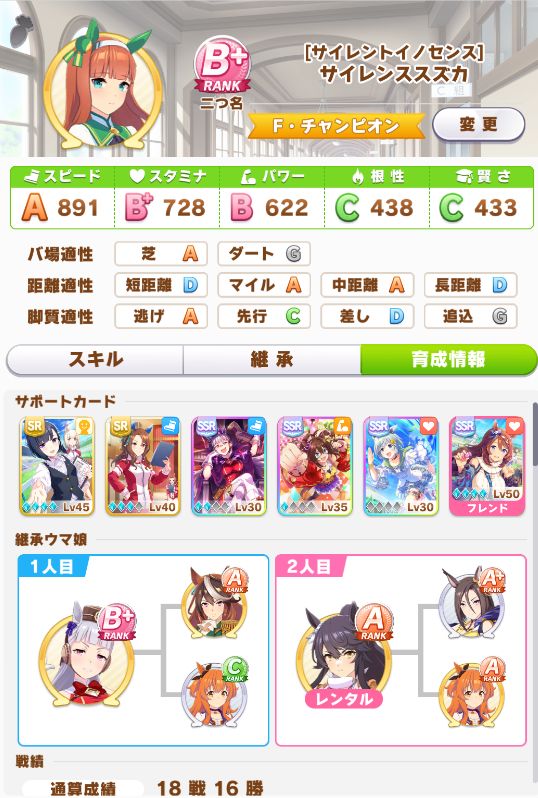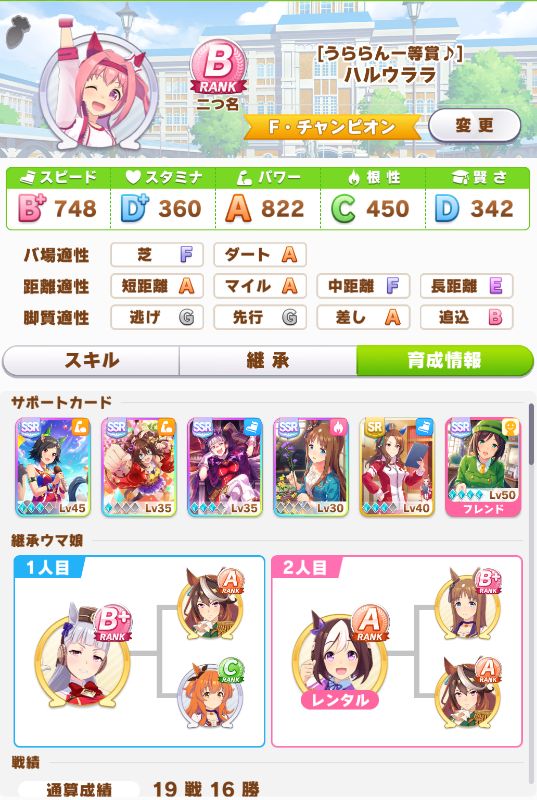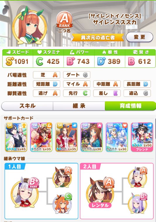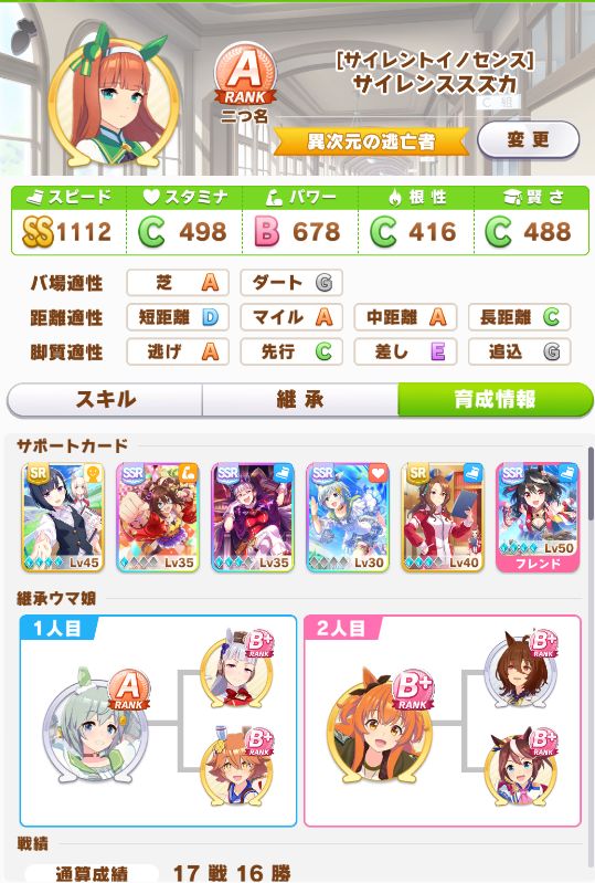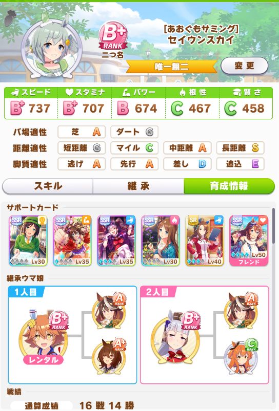 ところが、この時点でステータスは平坦過ぎて飛び抜けたものがないわ、スキルもサポカの相性が悪く、有用なのが全くないままで