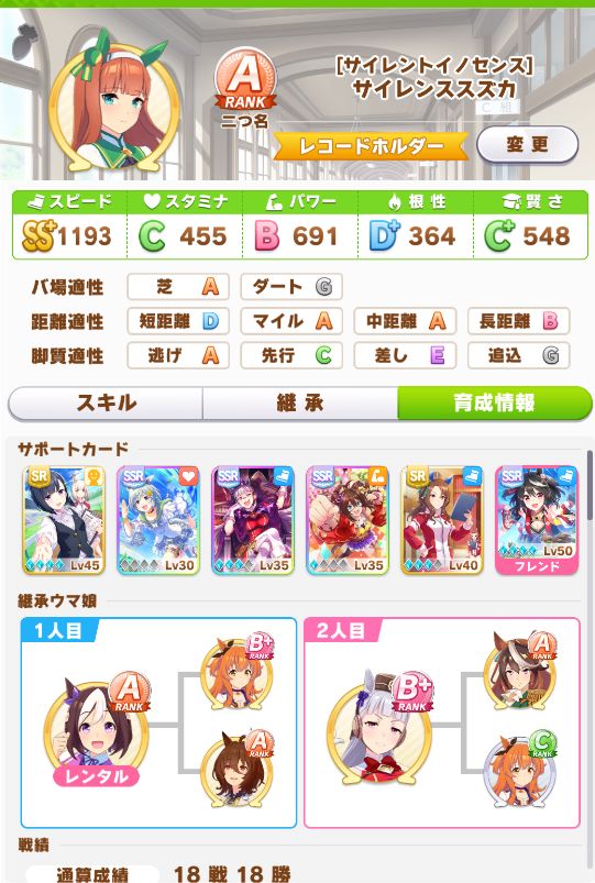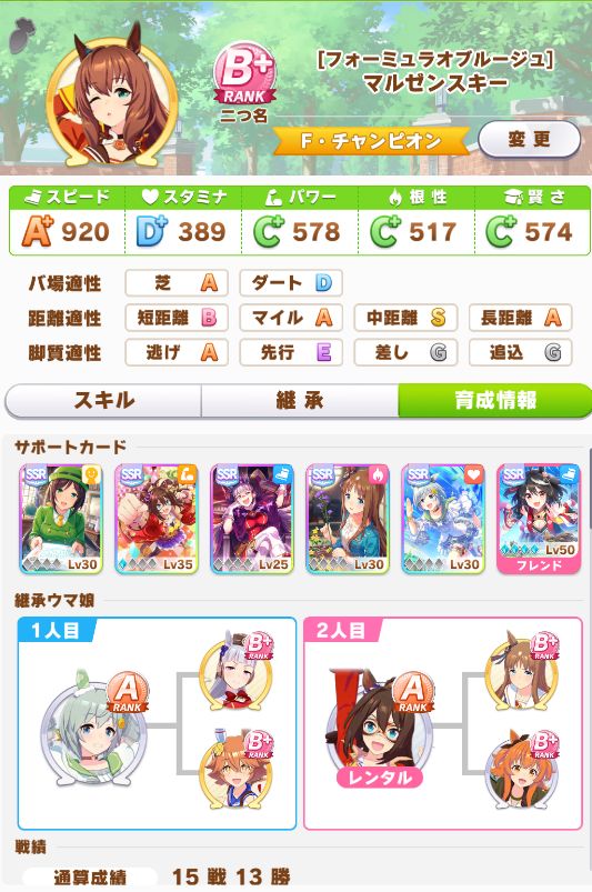 全部乗せは脚質や距離適性が合致してないので、これでURAは優勝出来てもチーム競技場向け育成には向いてないのかな