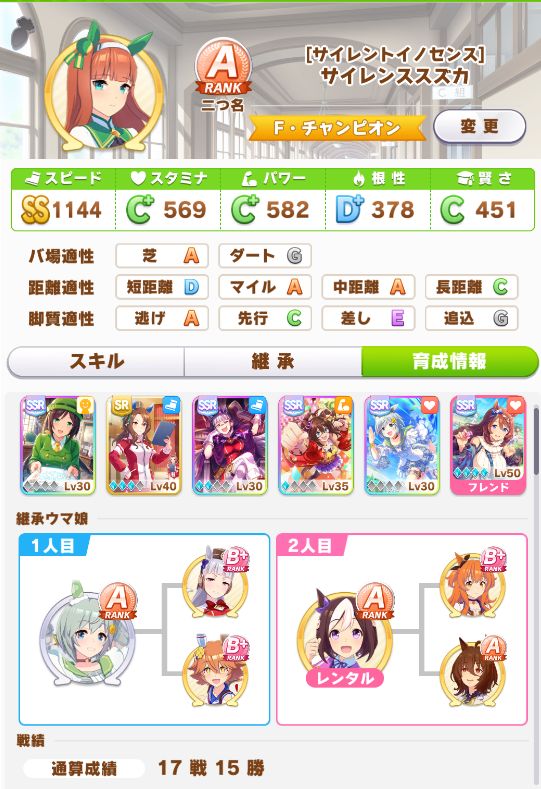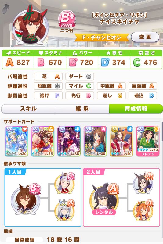 因子もスピード6パワー2、さらに親因子で地固め2も付いてて良い感じの結果に。