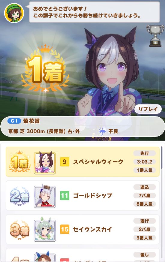 秋天は掛かるも3バ身mジャパンカップも3バ身で連覇。有馬は固有スキルが出ないままながら勝利