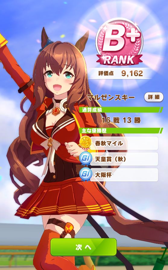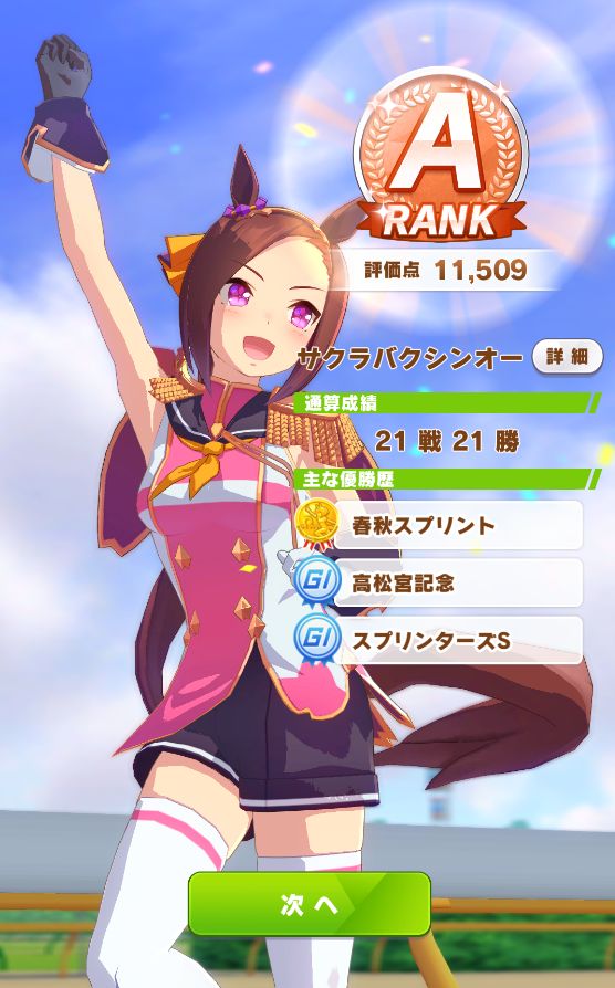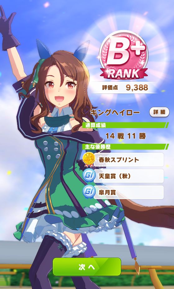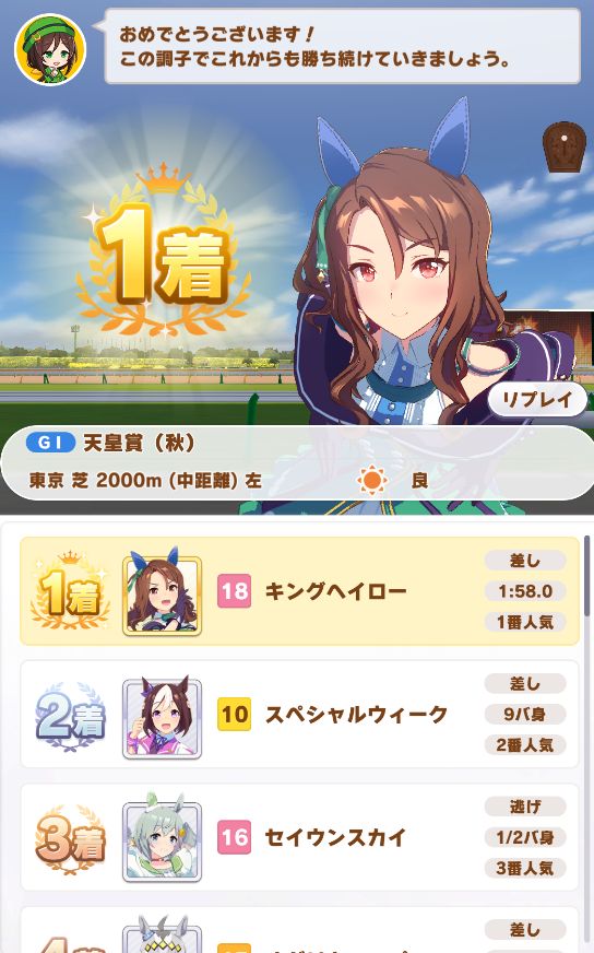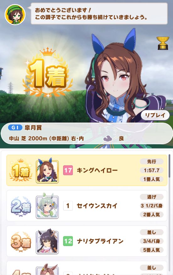 レース後、上々の面構えイベント。短距離なのでスタミナは気にせずハヤテ一文字のヒント獲得