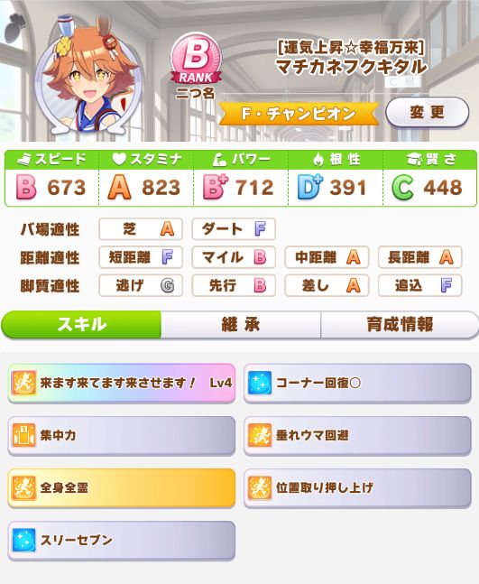 この時点でスタミナが700を超えだして、そろそろステータスを抑えて育成しないとマズイ状態だったので、極端な上振れせず助かった。