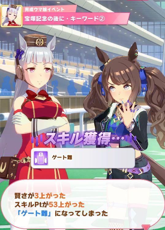 ゲート難のデバフスキルを狙う為クラシック級で宝塚に出走。内枠ながら無事勝利。