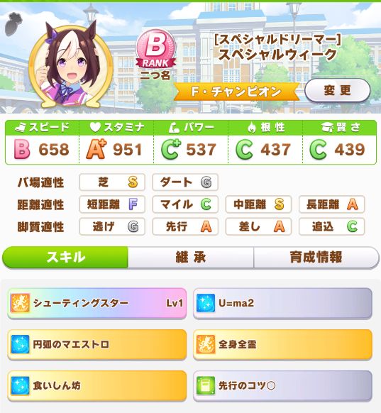 あと、スペちゃんの固有スキルは位置問わず追い抜いた段階で発動するので、それならと先行脚質で行ったら思惑通り発動率はほぼ100%。今回、差し脚質は追込脚質と同じような位置に下がっている印象なので、先行脚質の方がスペちゃんには合ってる模様。