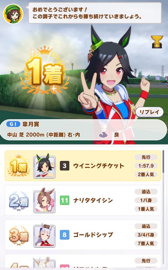 相手のネイチャ(1番人気)は定番のデバフかと思いきや、普通に勝つ用のスキルを持った娘だったのも助かった。もしデバフモリモリの娘が複数人いたら流石に無理だったと思う。