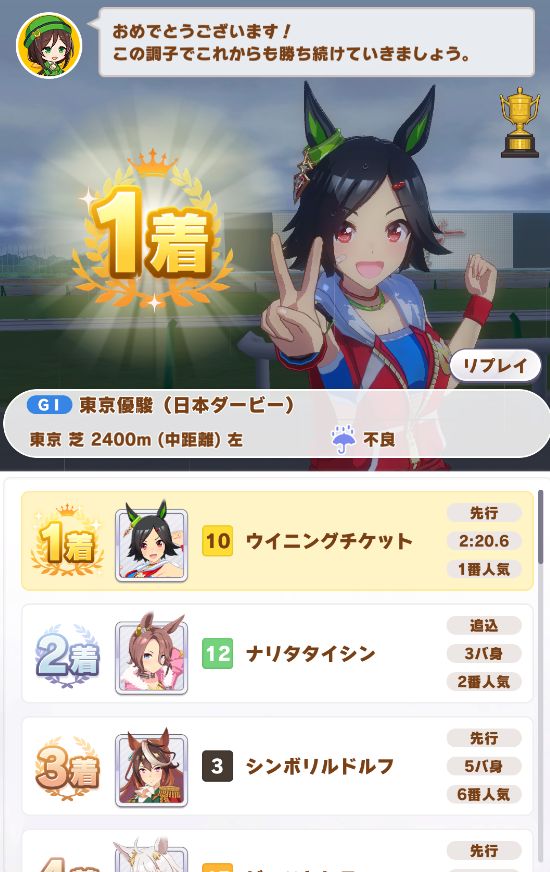 レースはゴルシが唯一、ゲート難から何まで全てのスキルを披露しての勝利。