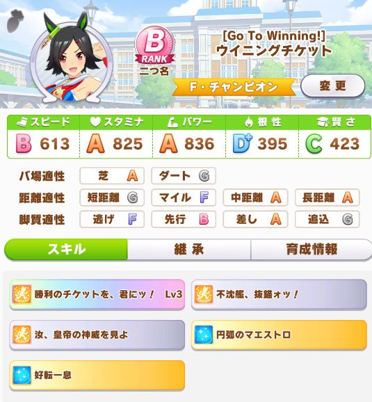 前回はマイルを走らせるにはイマイチなステータスだったので、差し脚質でそこそこのステータスに出来た印象。