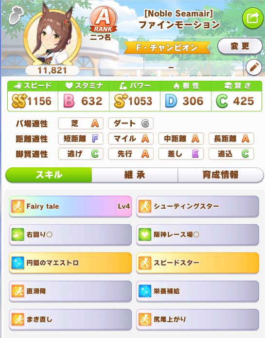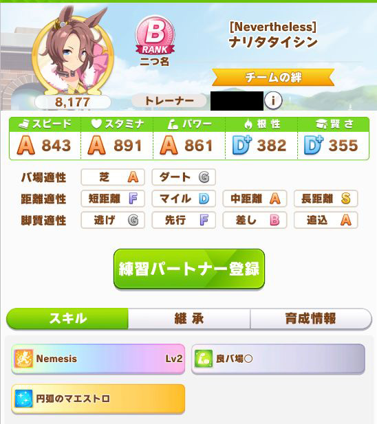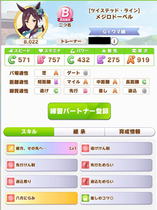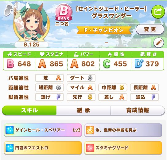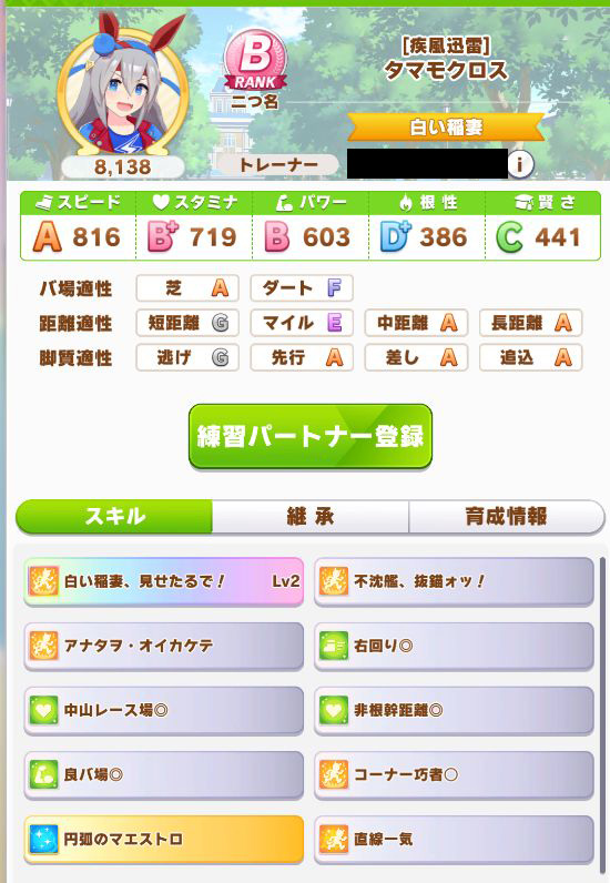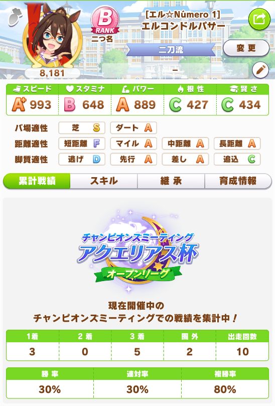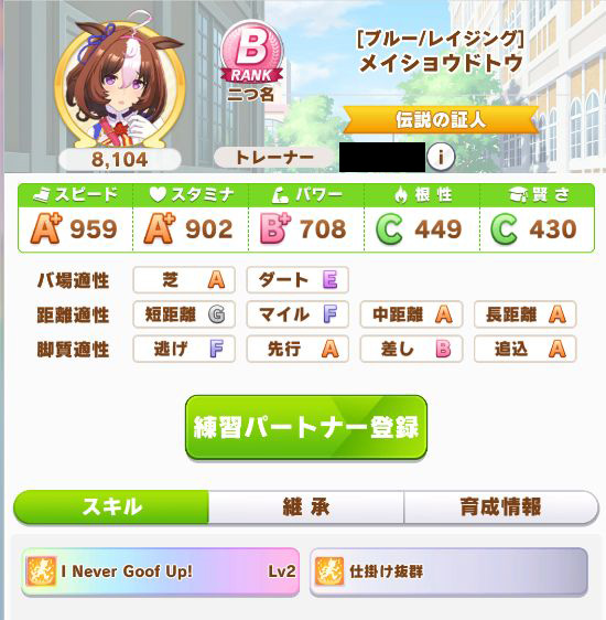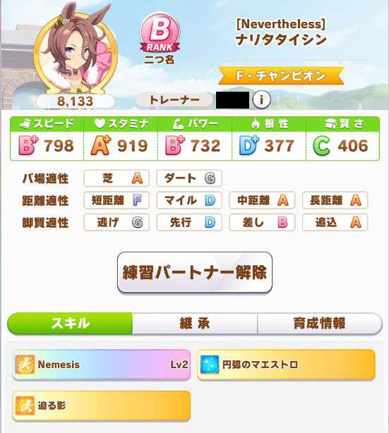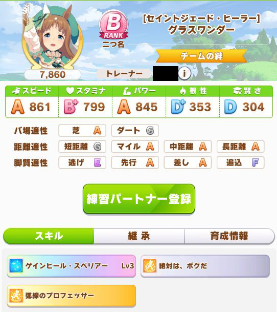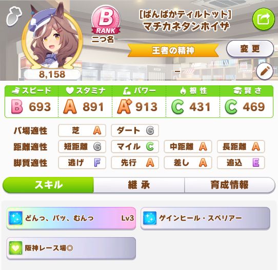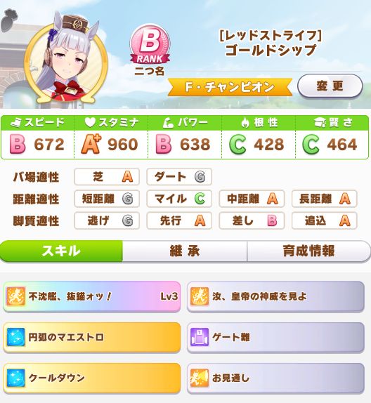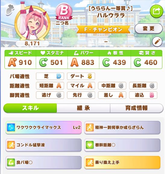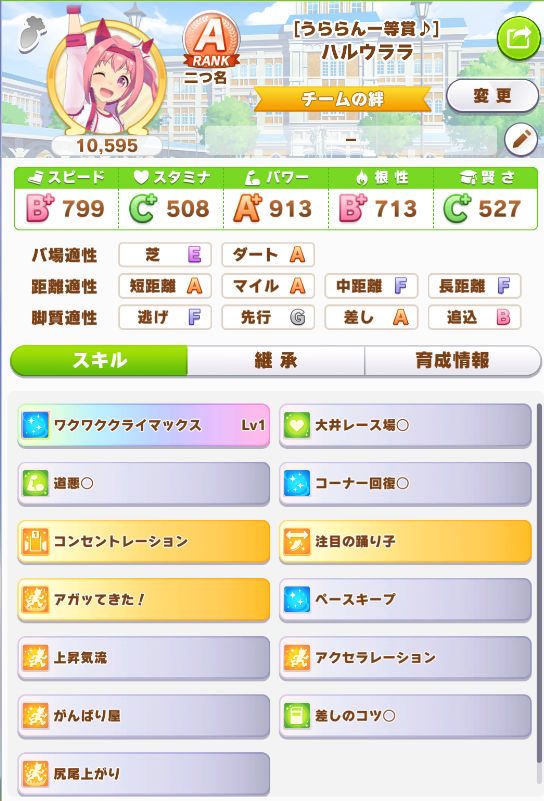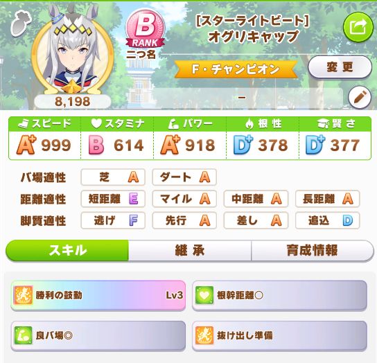初育成より若干下振れたものの、悪くないステータスに。