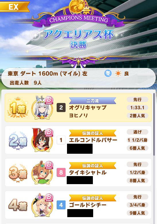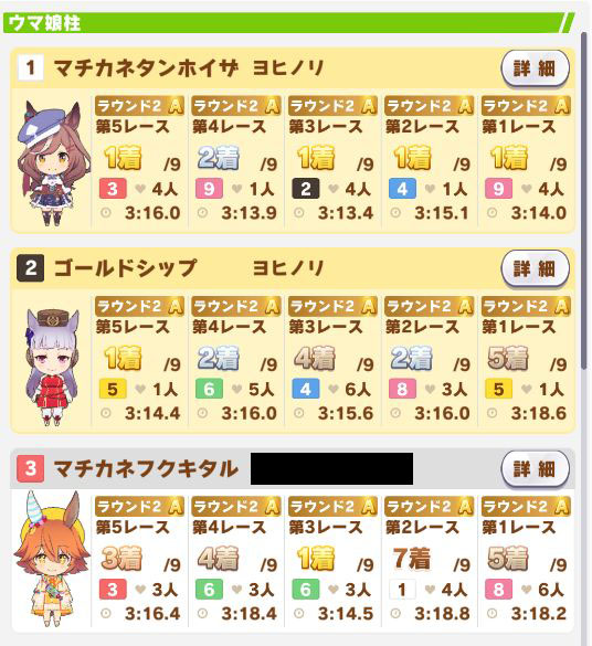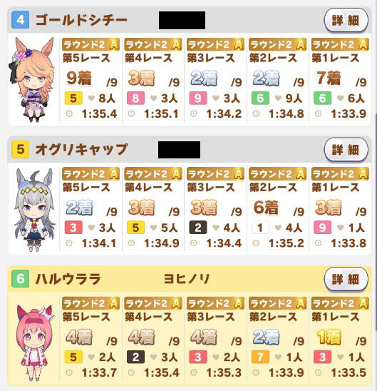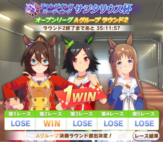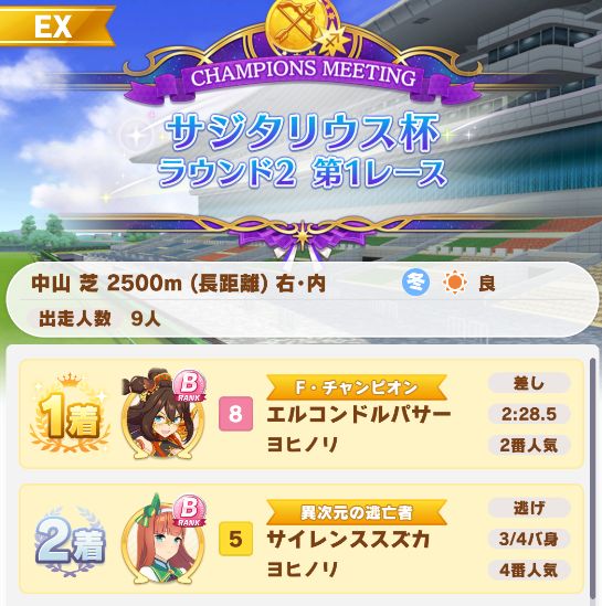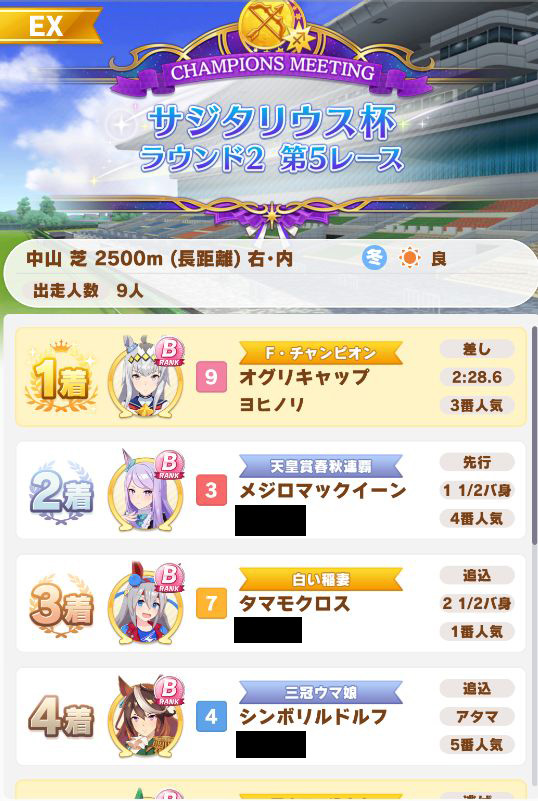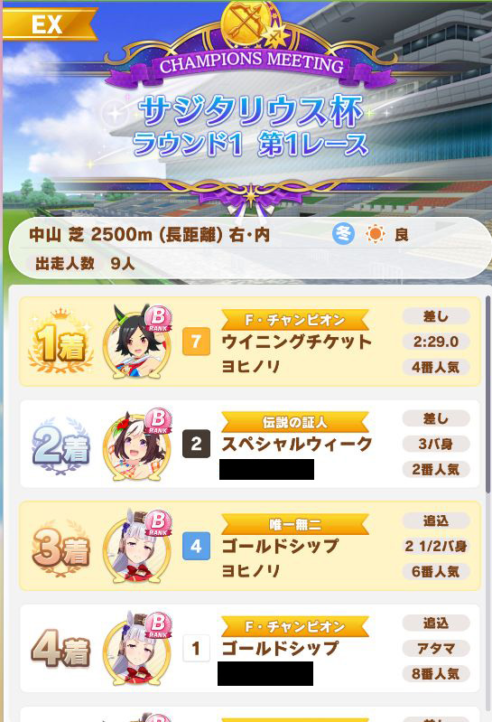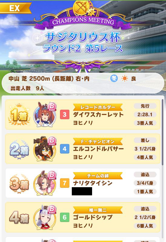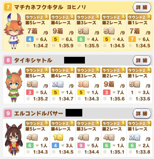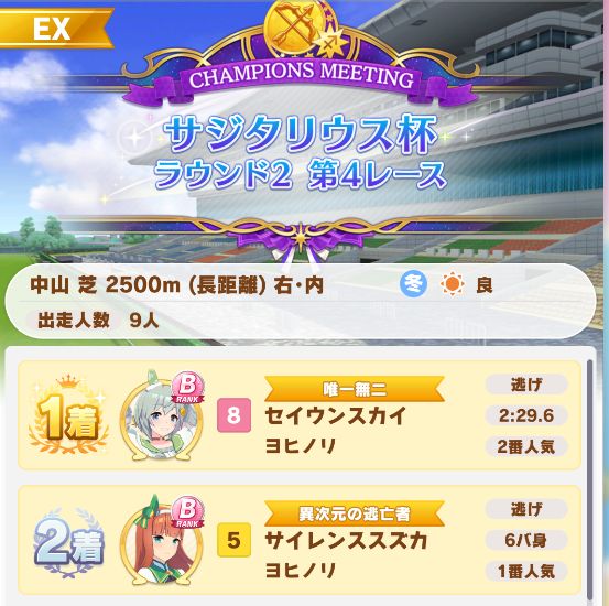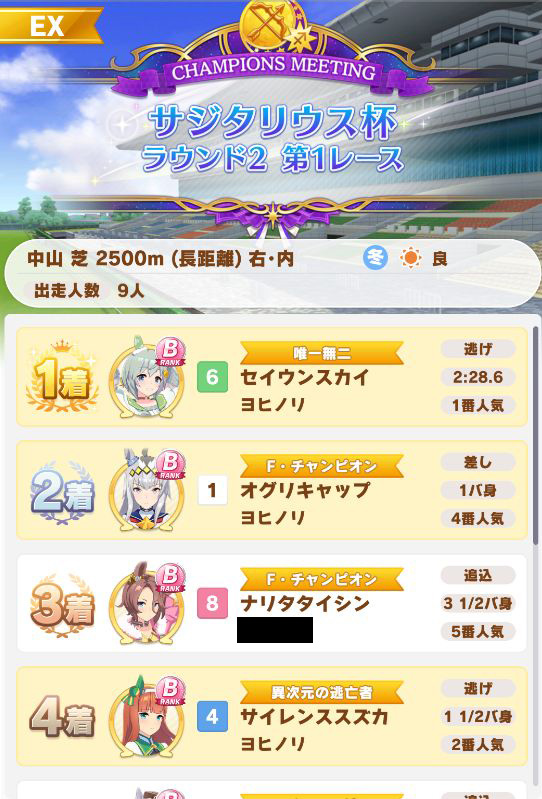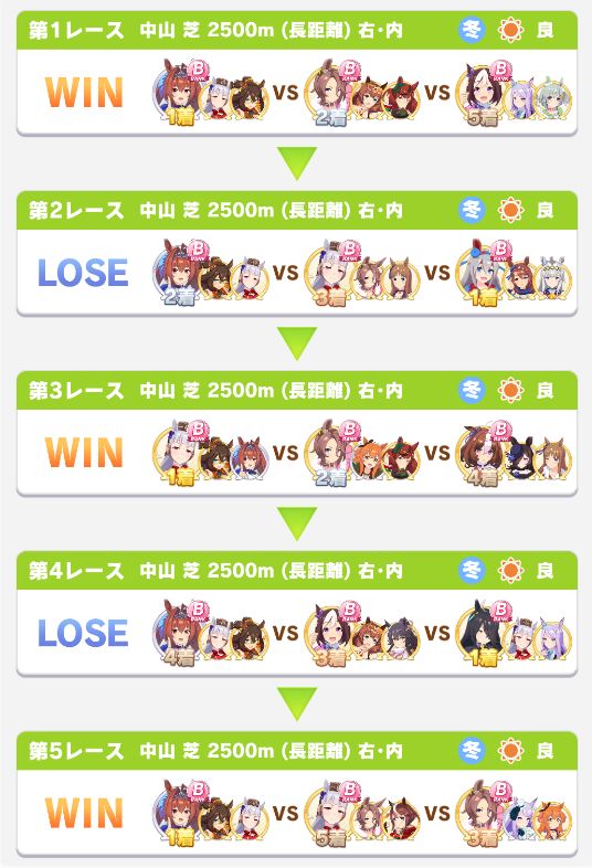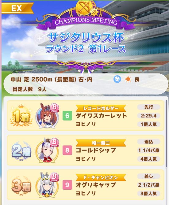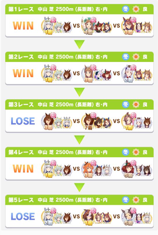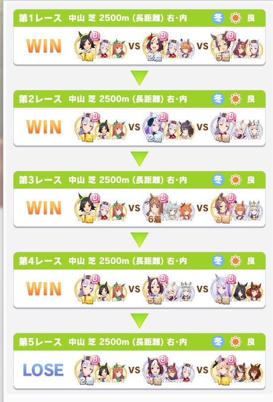 以下マチタン、ヒーラーグラス、相手のゴルシ、フク、ゴルシ、ネイチャ、クリーク、オペラオーという結果に。