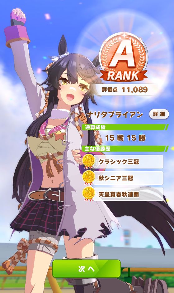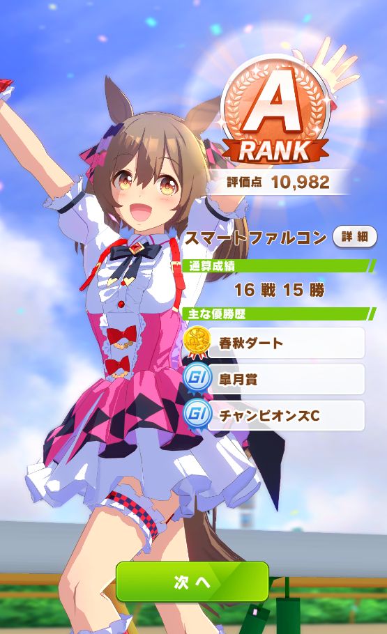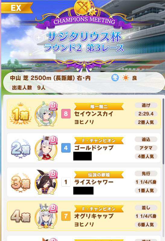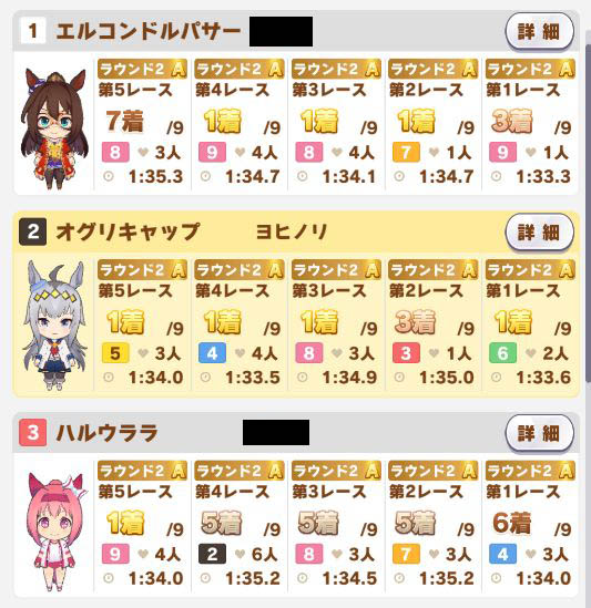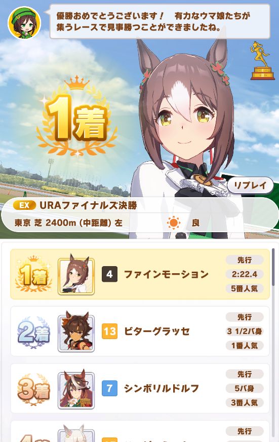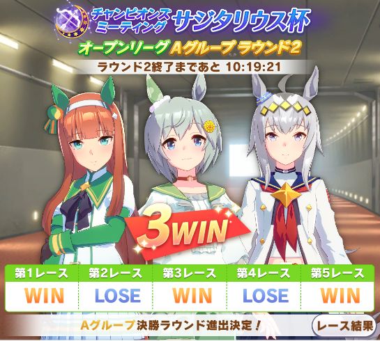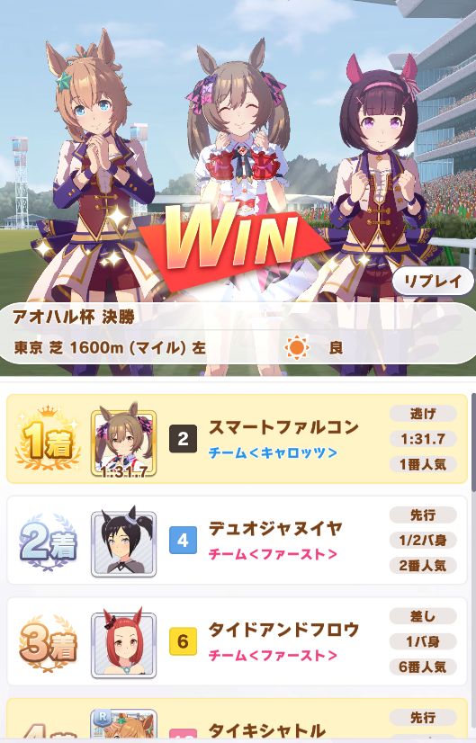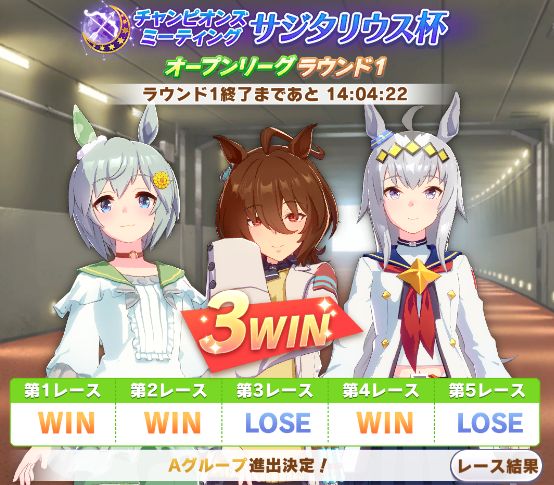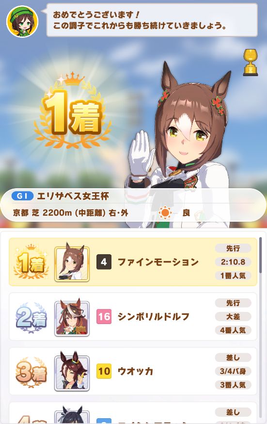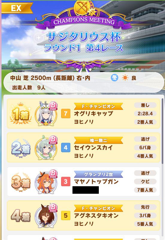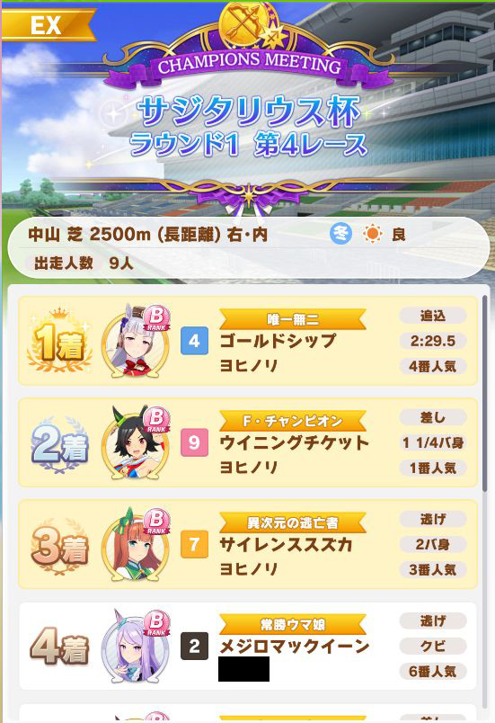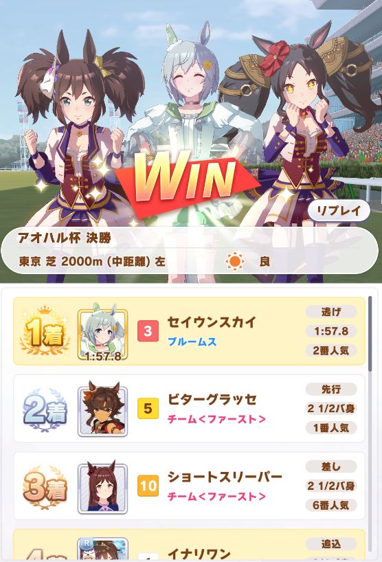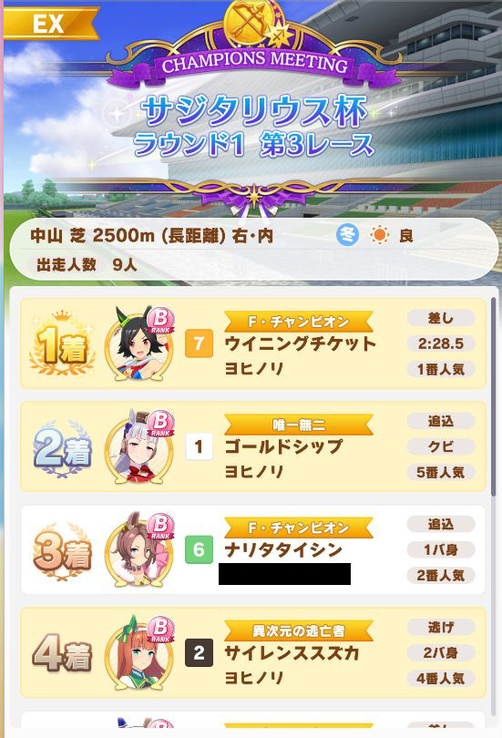 以下マチタン、ヒーラーグラス、相手のゴルシ、フク、ゴルシ、ネイチャ、クリーク、オペラオーという結果に。