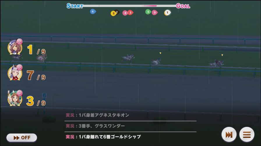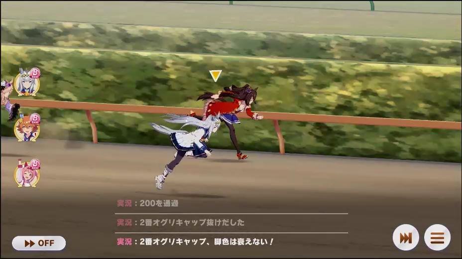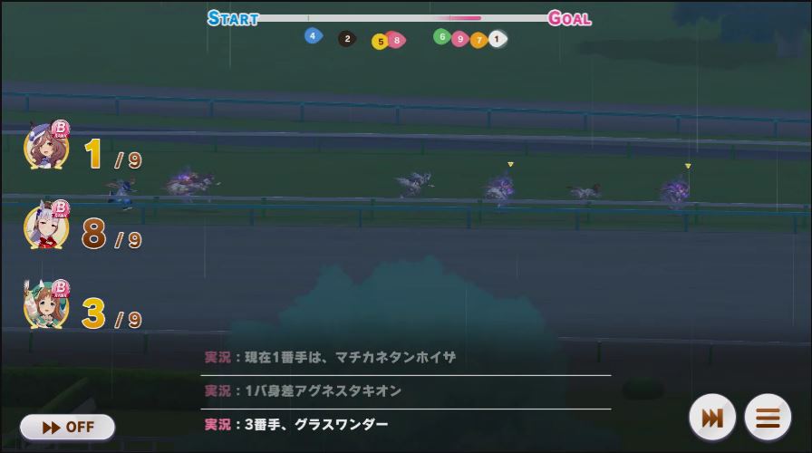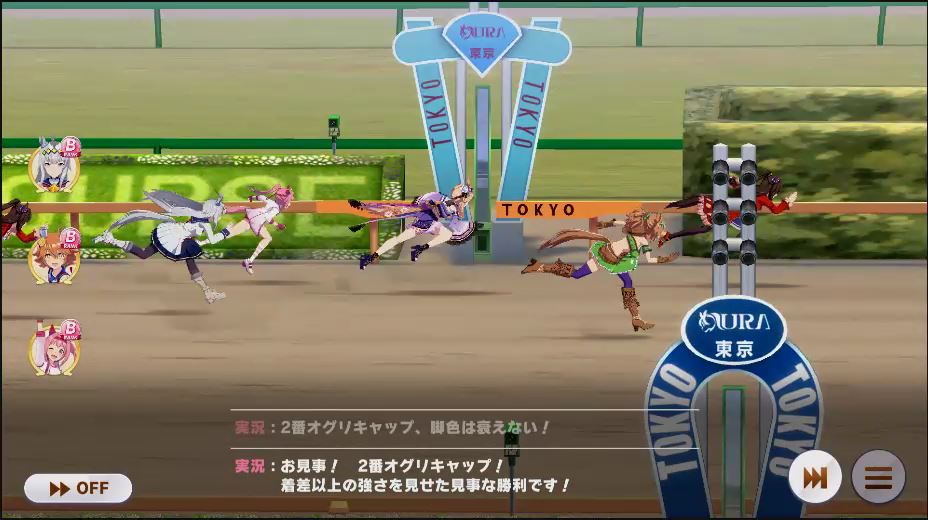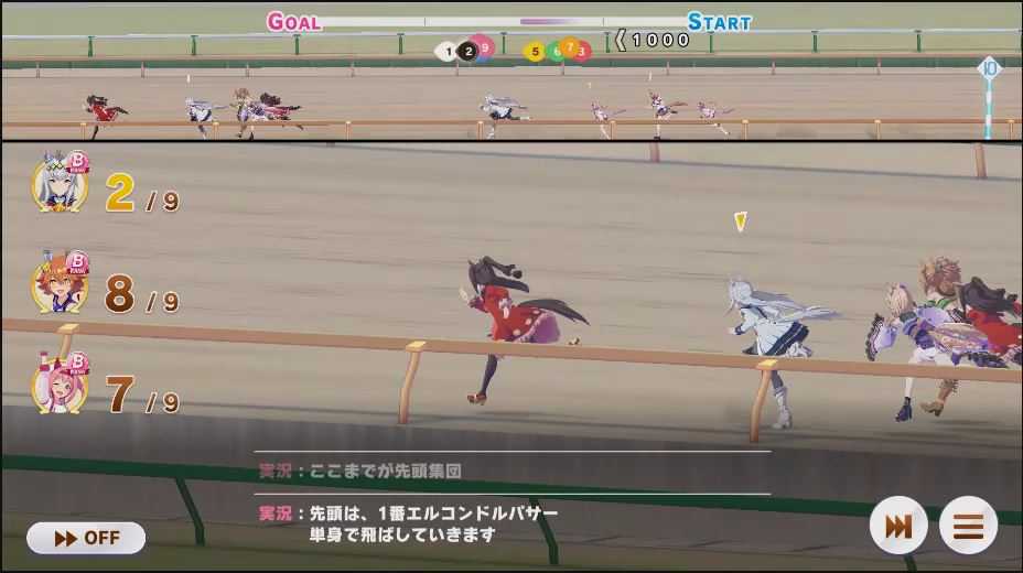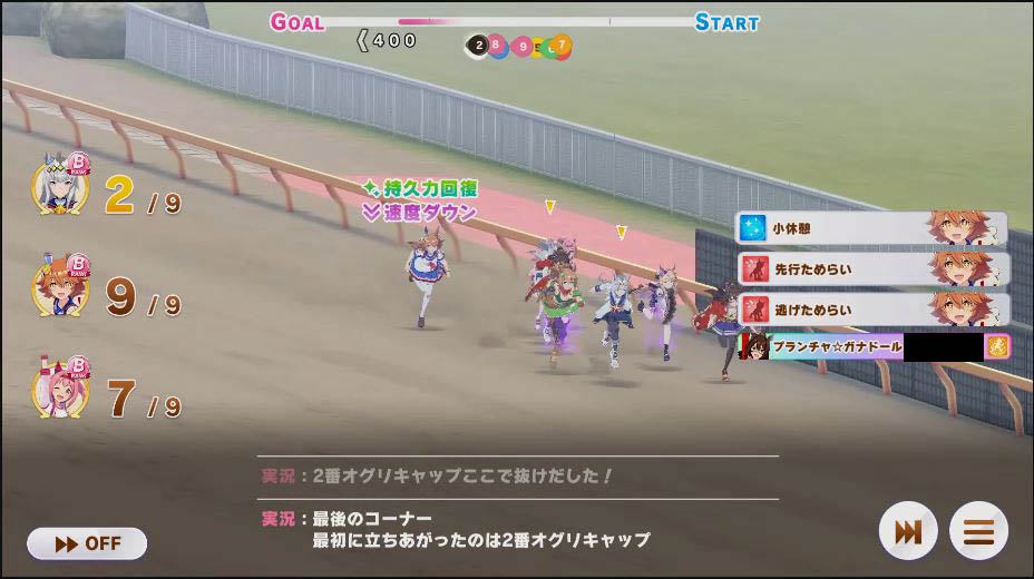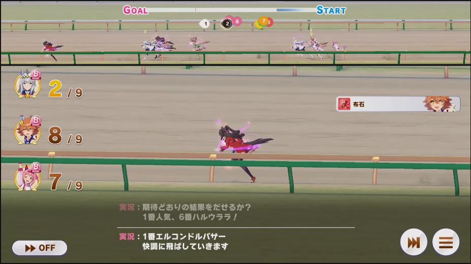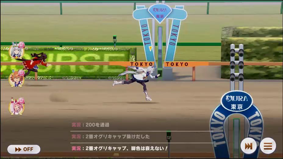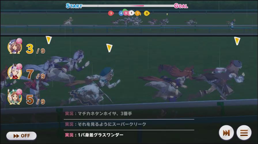逃げ1人(エル)先行4人(オグリ、エル、タイキ、和服シチー)差し3人(ウララ、フク、オグリ)追い込み1人(ウララ)