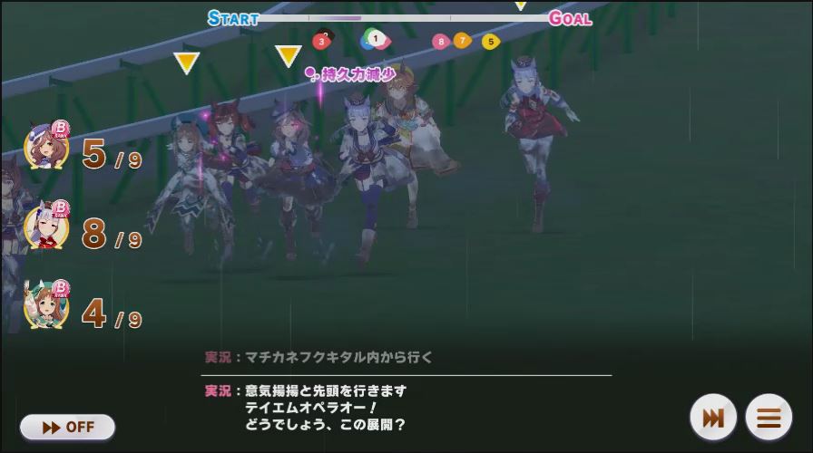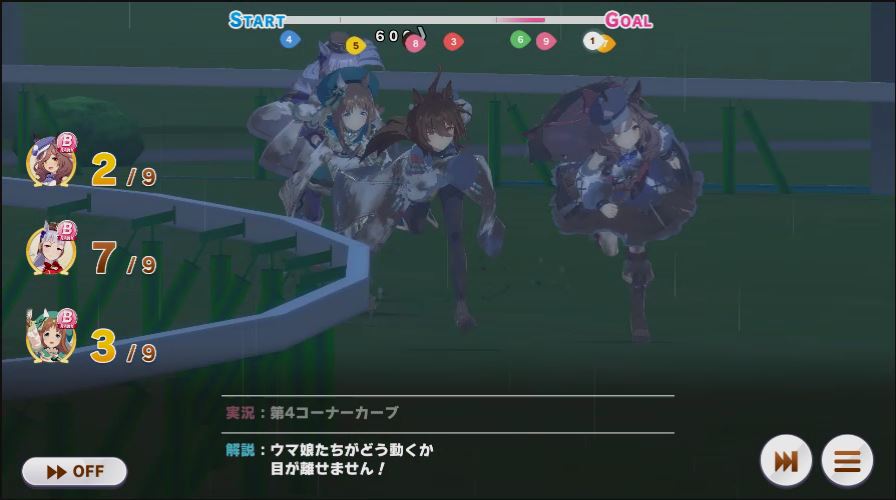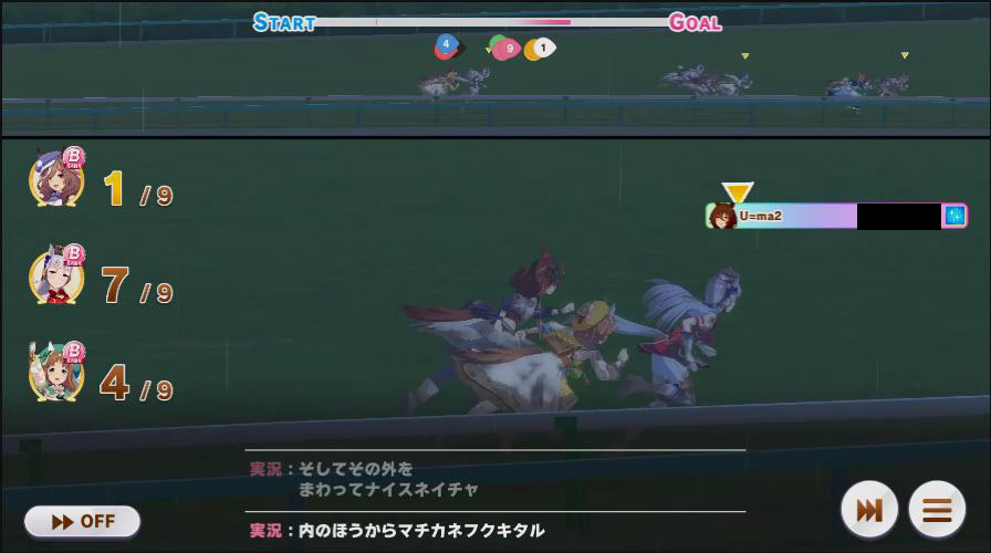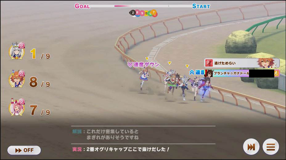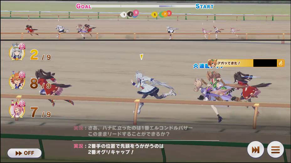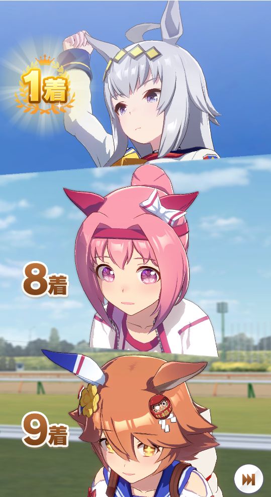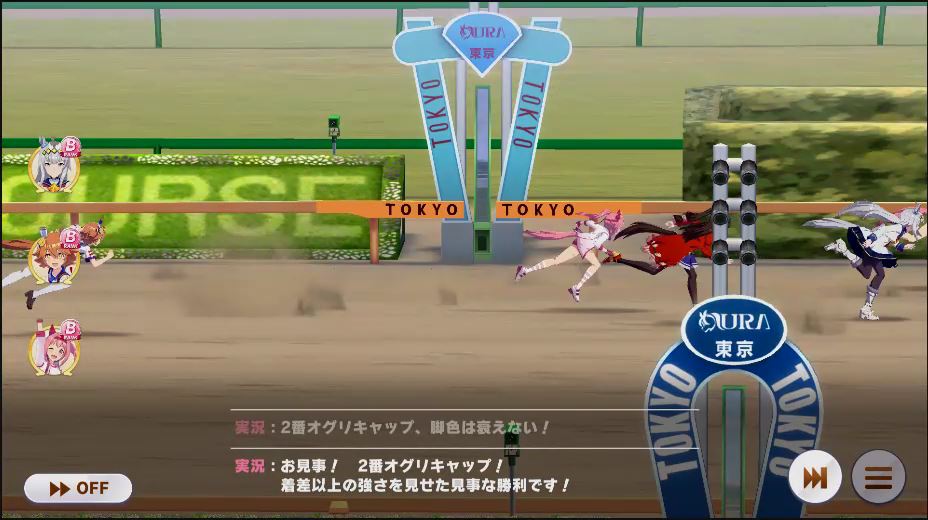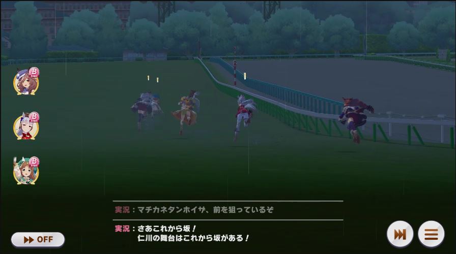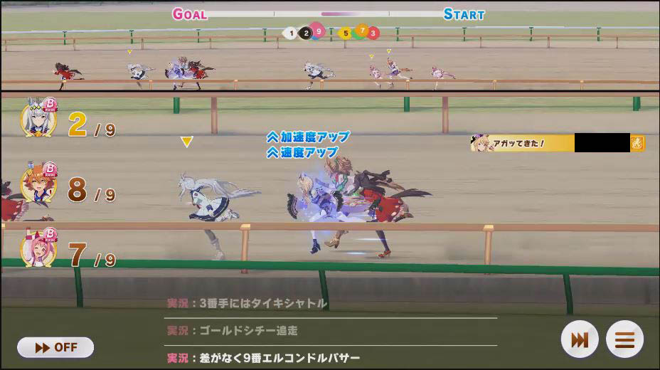 逃げ1人(エル)先行4人(オグリ、エル、タイキ、和服シチー)差し3人(ウララ、フク、オグリ)追い込み1人(ウララ)