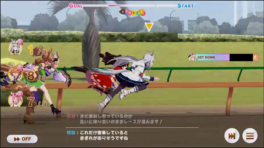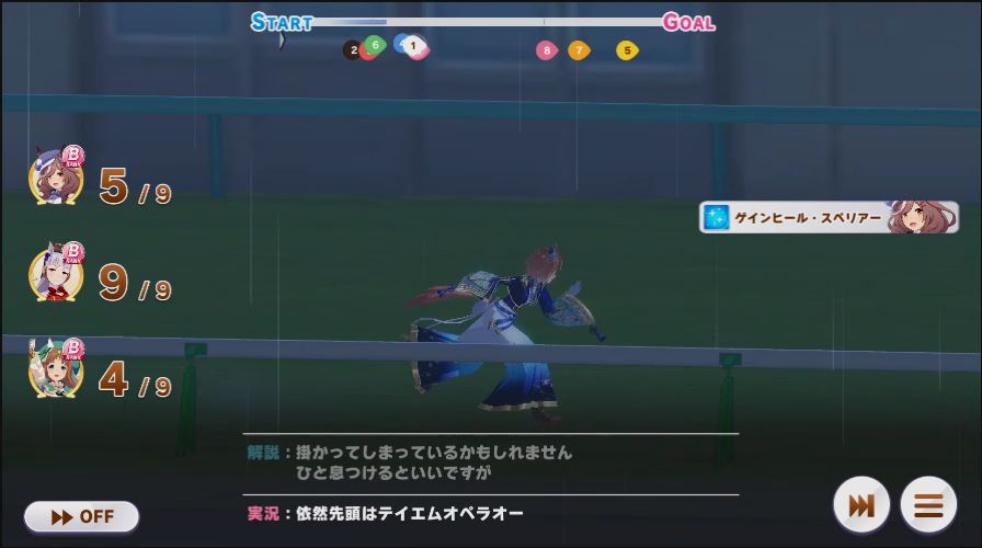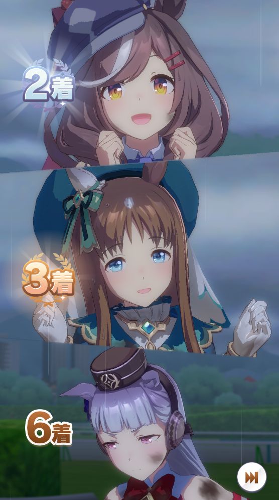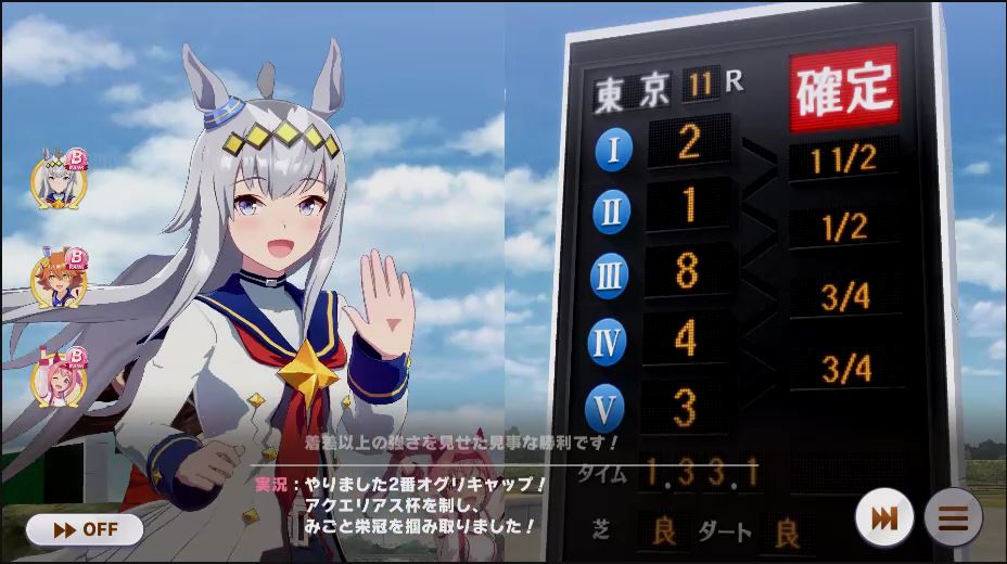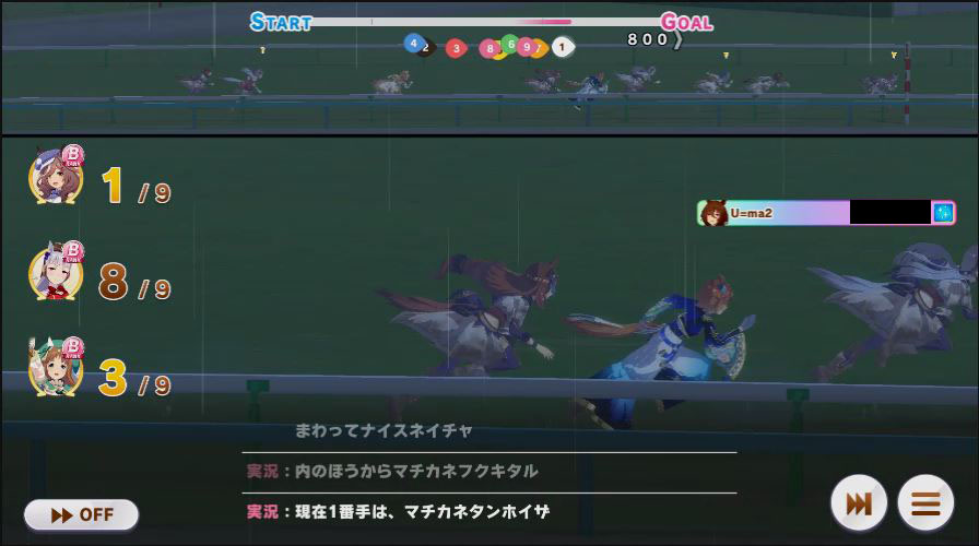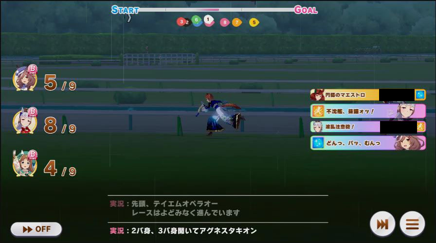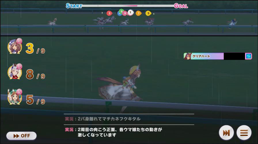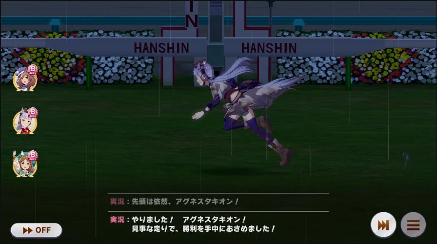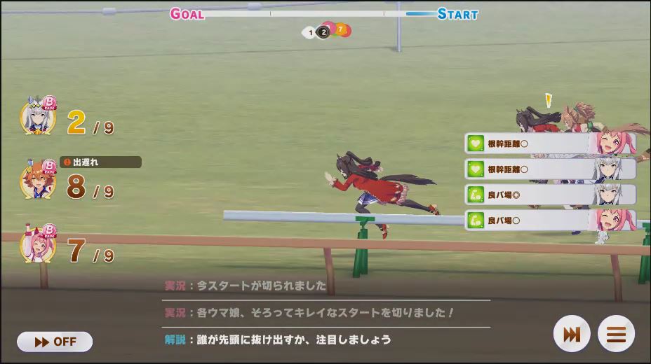 逃げ1人(エル)先行4人(オグリ、エル、タイキ、和服シチー)差し3人(ウララ、フク、オグリ)追い込み1人(ウララ)