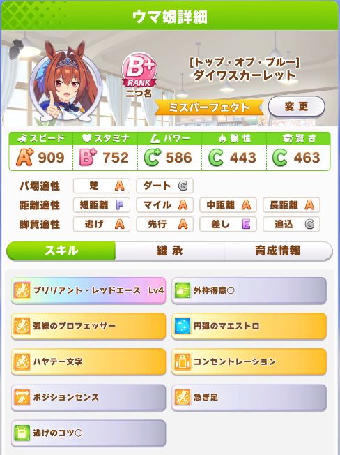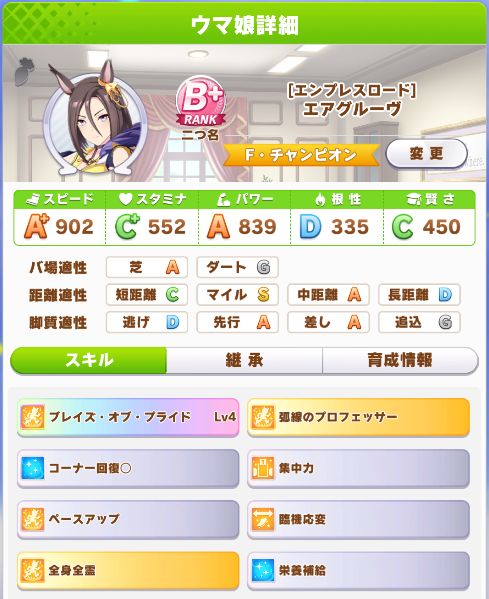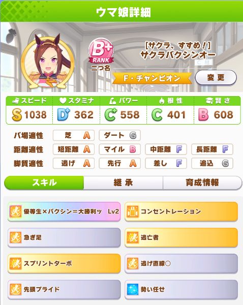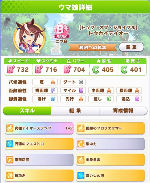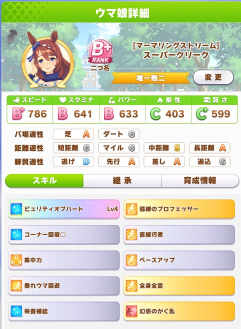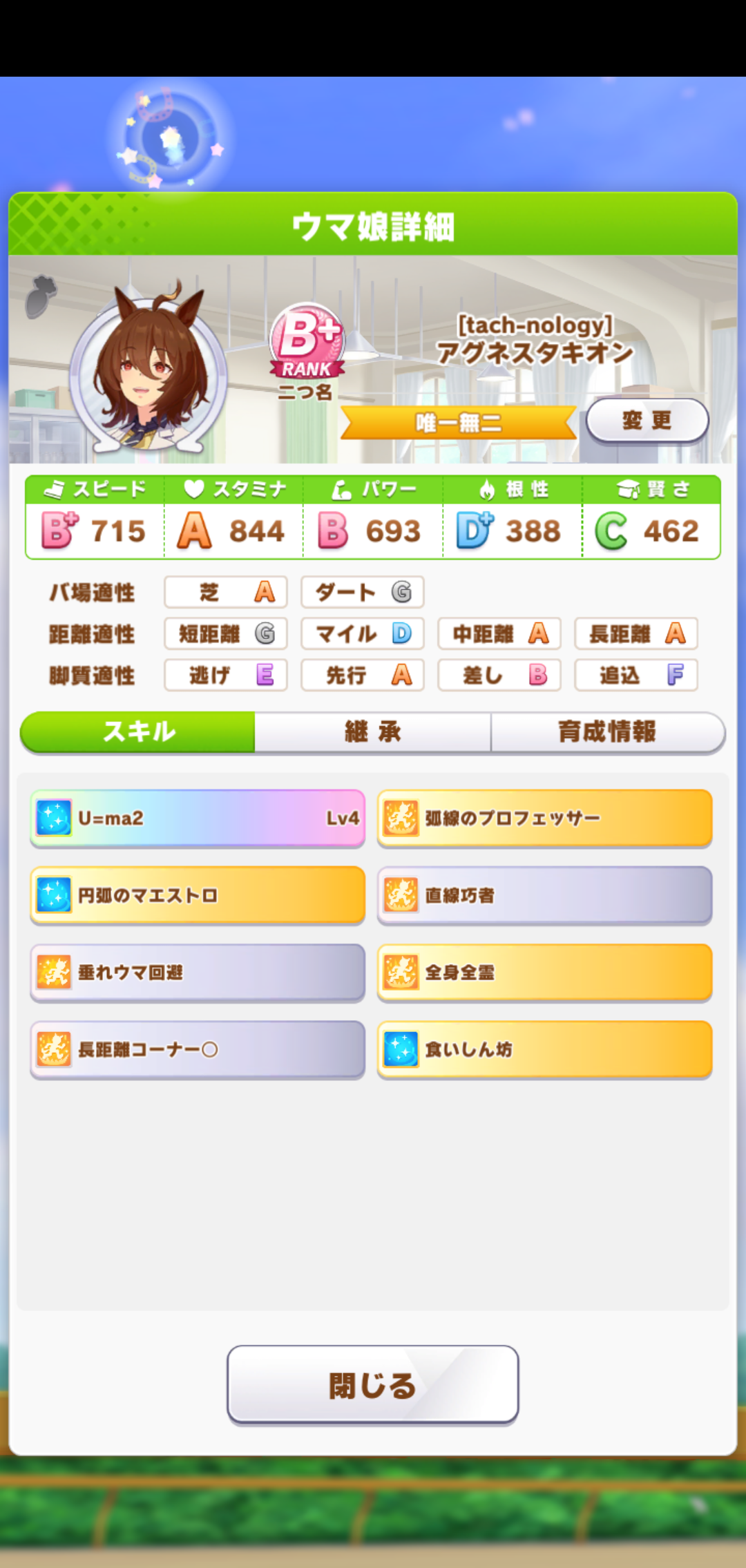 長距離適性をBのままだったことを始めてから気づき、スタミナを重点的に上げつつの育成に。