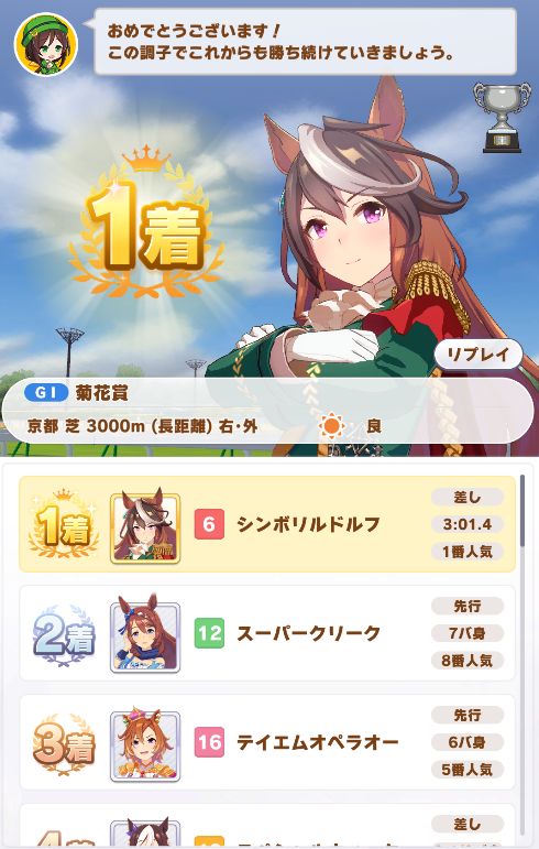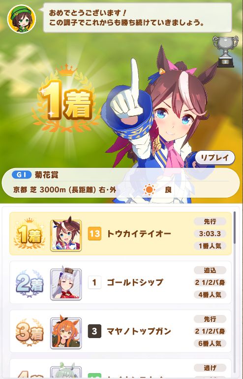 菊花賞を回復スキル発動せずに勝ち、三冠達成。